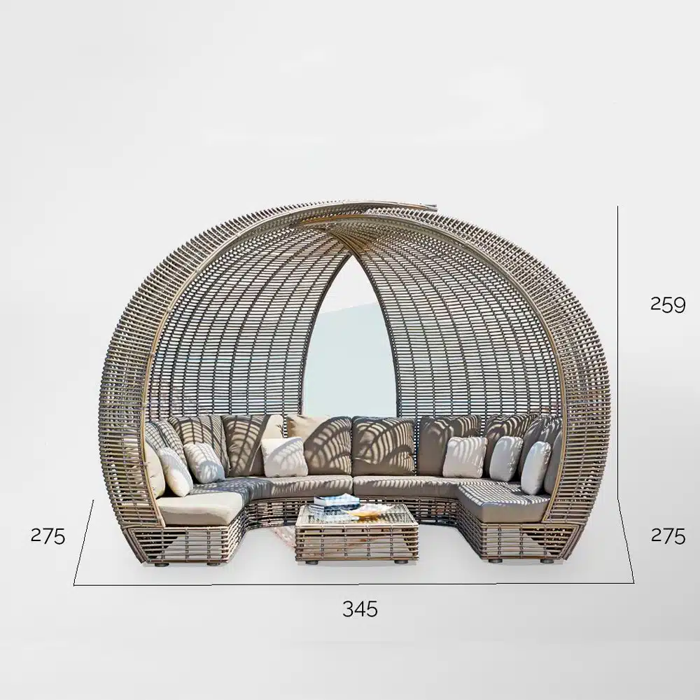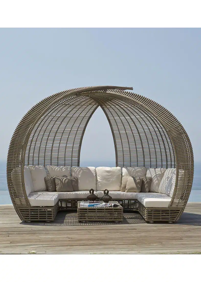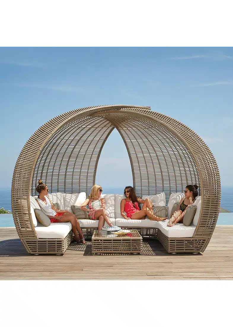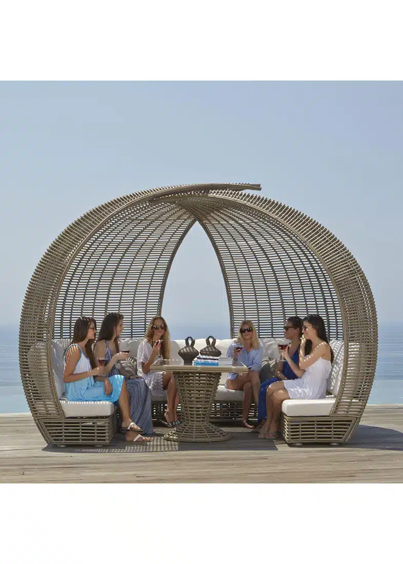 Plecionka z technorattanu na malowanej aluminiowej ramie wytrzyma każde warunki pogodowe, co pozwoli na korzystanie z altany przez cały rok. Zakrzywiony daszek chroni przed gorącym letnim słońcem. Grube i miękkie poduszki są pokryte wodoodporną tkaniną. Altanę można uzupełnić stolikiem kawowym.