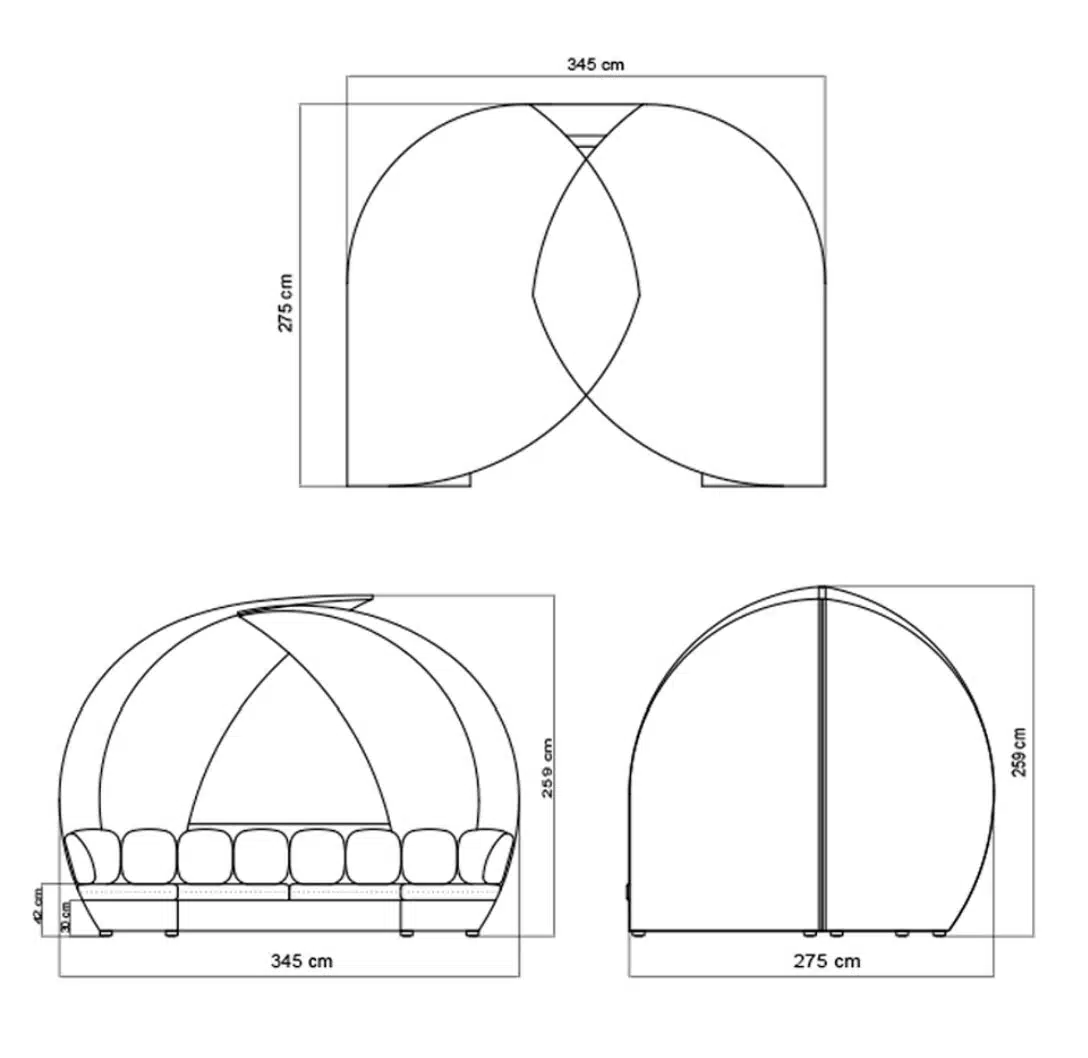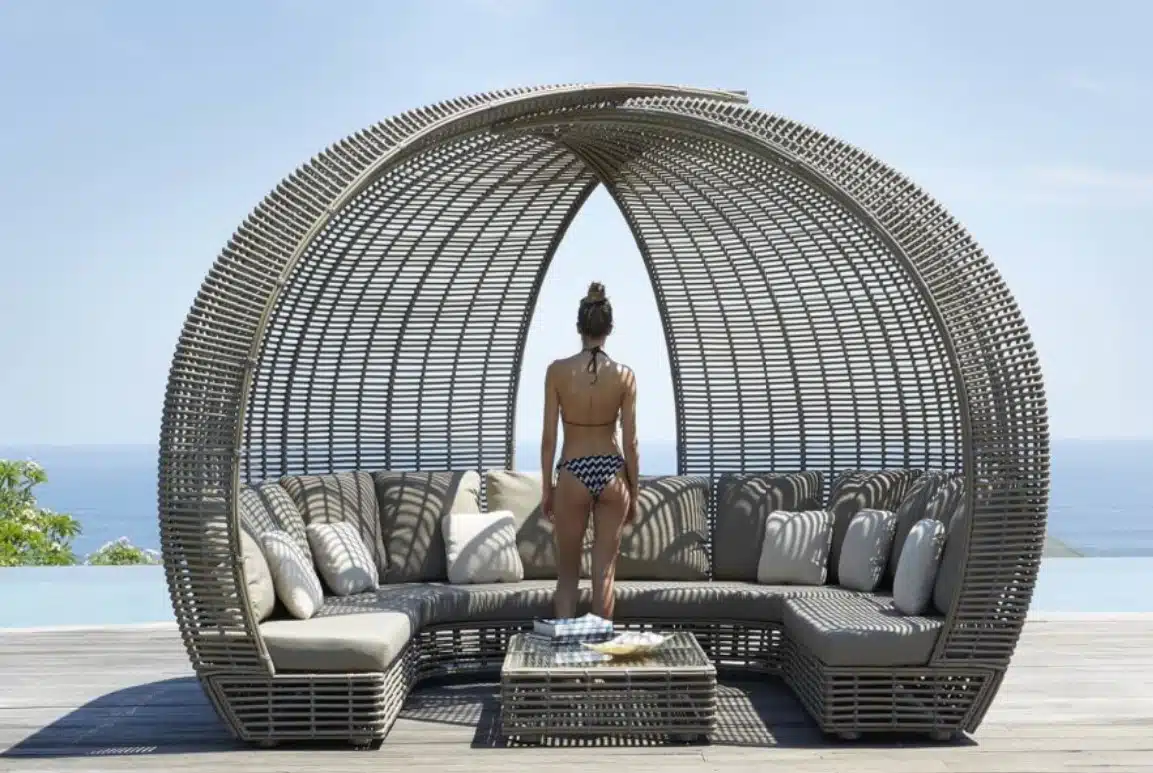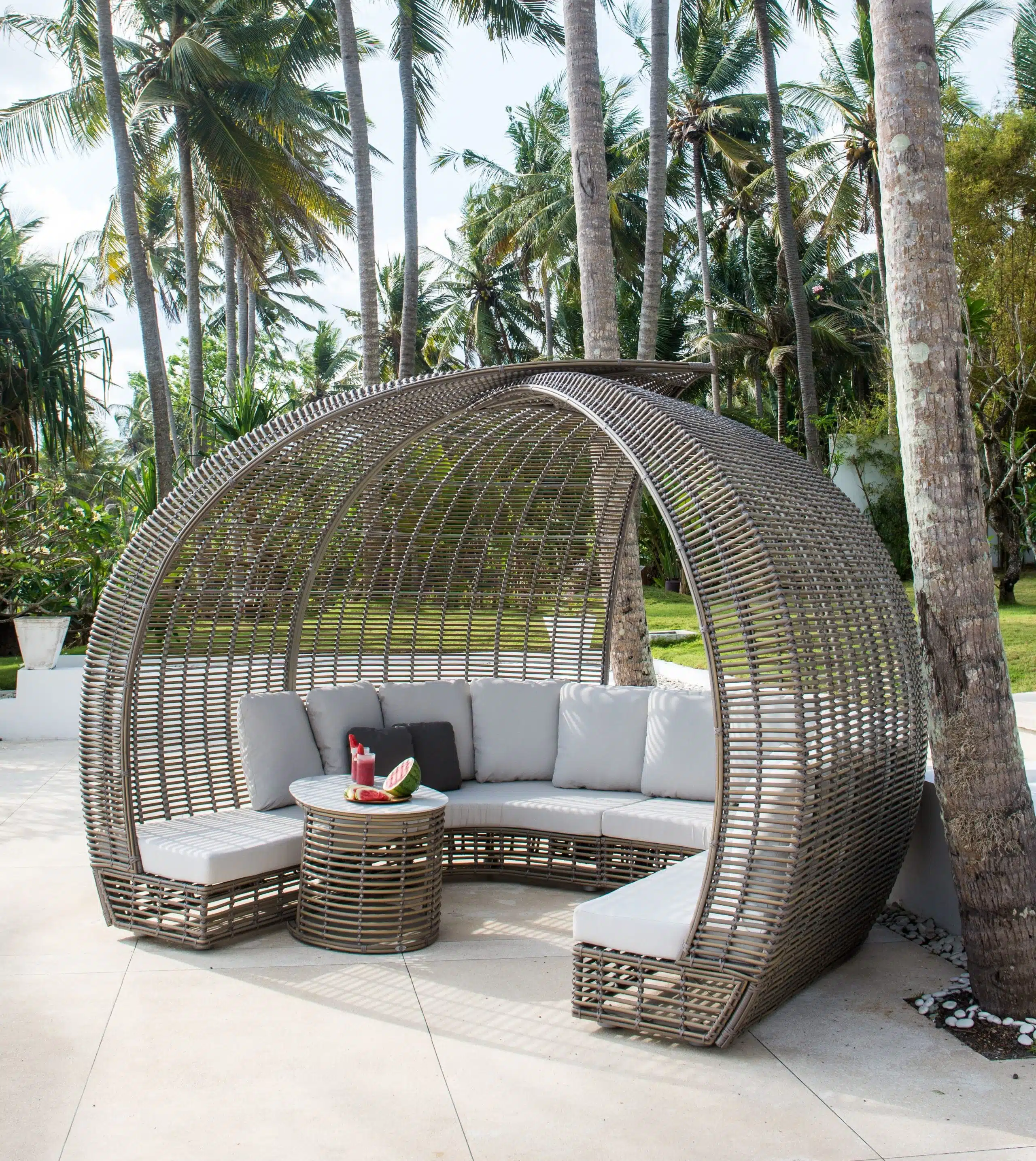 Plecionka z technorattanu na malowanej aluminiowej ramie wytrzyma każde warunki pogodowe, co pozwoli na korzystanie z altany przez cały rok. Zakrzywiony daszek chroni przed gorącym letnim słońcem. Grube i miękkie poduszki są pokryte wodoodporną tkaniną. Altanę można uzupełnić stolikiem kawowym.