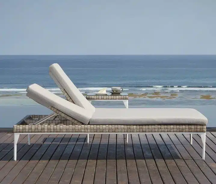 Rama wykonana z aluminium malowanego na biało. Splot wykonany jest z technorattanu SEASHELL FLAT-FLAT 30 mm, w przyjemnym beżowym kolorze z brązowym odcieniem. Wysokie i miękkie poduszki są pokryte wodoodporną tkaniną.